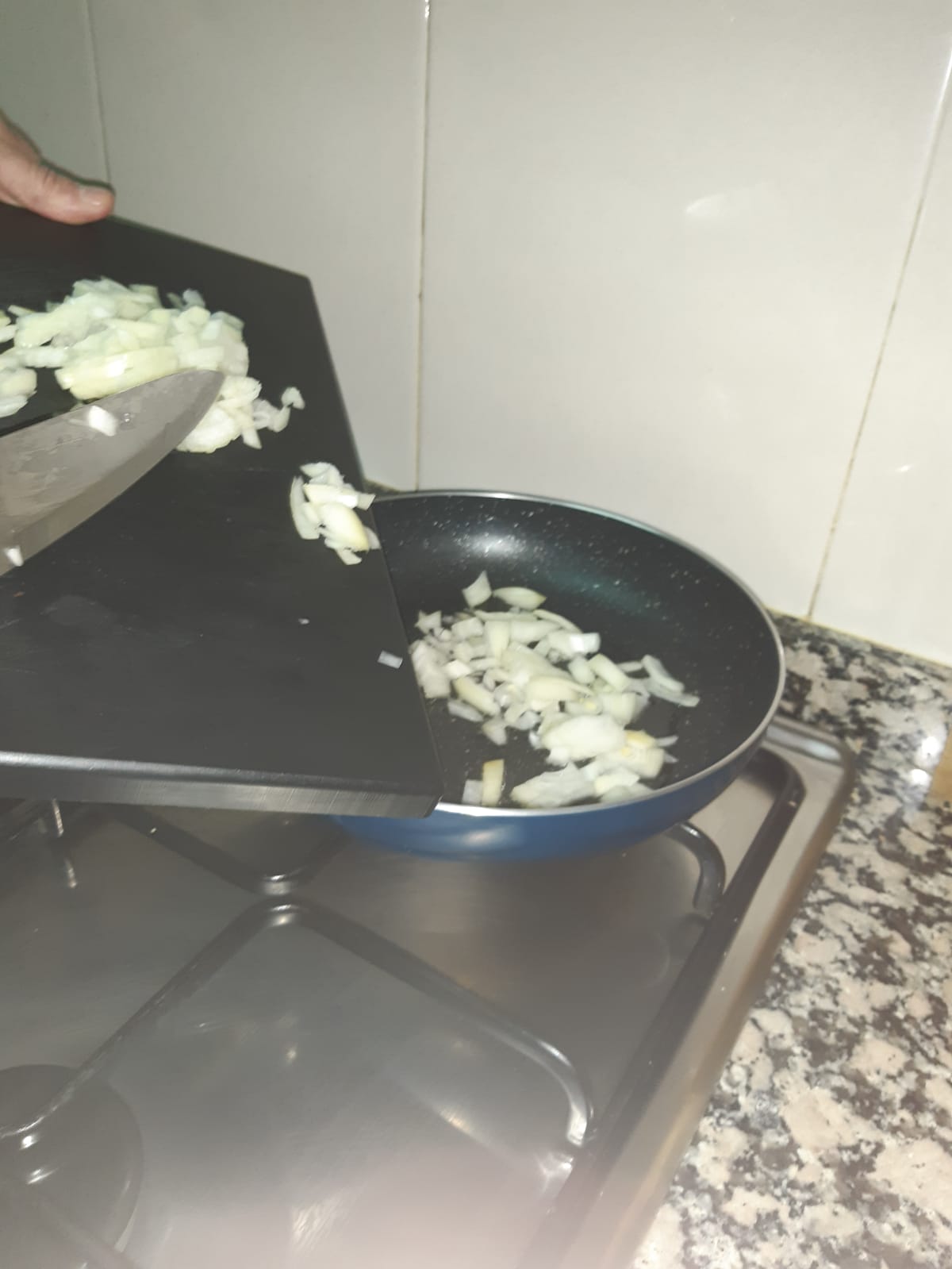 - Tallem la ceba en trosses petits i la posem, juntament amb un ragolí d’oli d’oliva, en una pella a foc lent. Anem remenant la ceba mentre es cou.