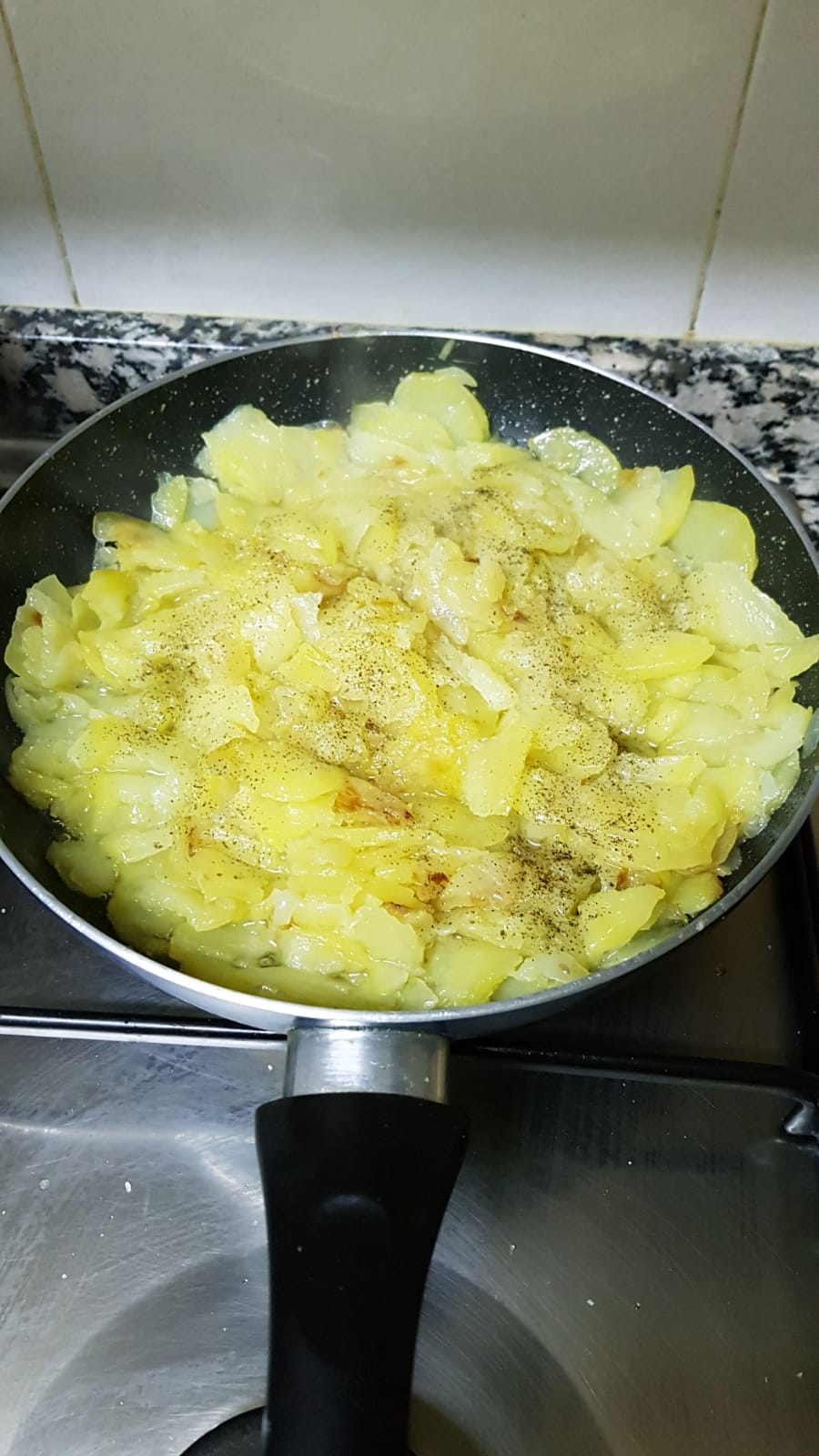 - Netegem les patates, les pelem i les tallem, no gaire dobles. u cop la ceba estigui daurada, posem les patates i el pebre.