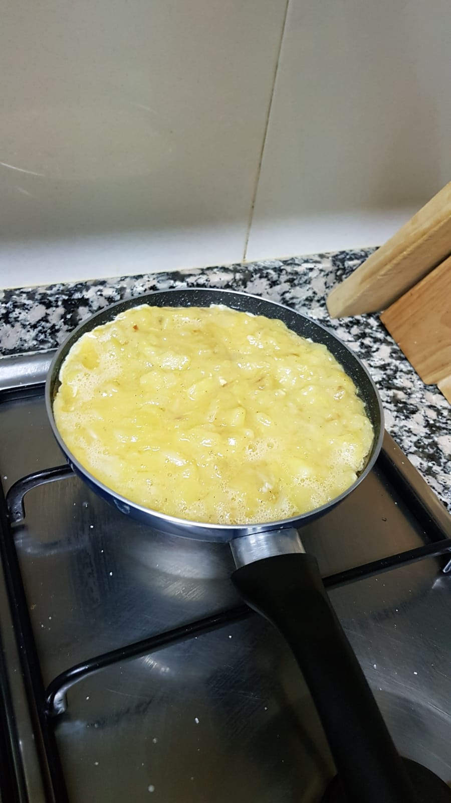 - Posem una paella amb una mica d’oli al foc i quan aquest estigui calent hi posem la mescla anterior (patata amb ou).